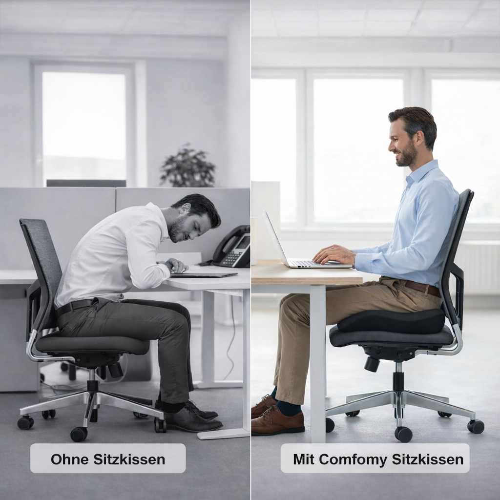 Viele merken gar nicht, wie sehr unbequemes Sitzen den Arbeitstag beeinflusst. Ständiges umsetzen, aufstehen und ein unbequemer Stuhl kosten Konzentration. Unser Comfomy Sitzkissen sorgt für ein ruhigeres, entspannteres Sitzgefühl. Du sitzt dank optimale Druckverteilung deutlich angenehmer und musst dich weniger bewegen und kannst dich besser auf das Wesentliche konzentrieren.
